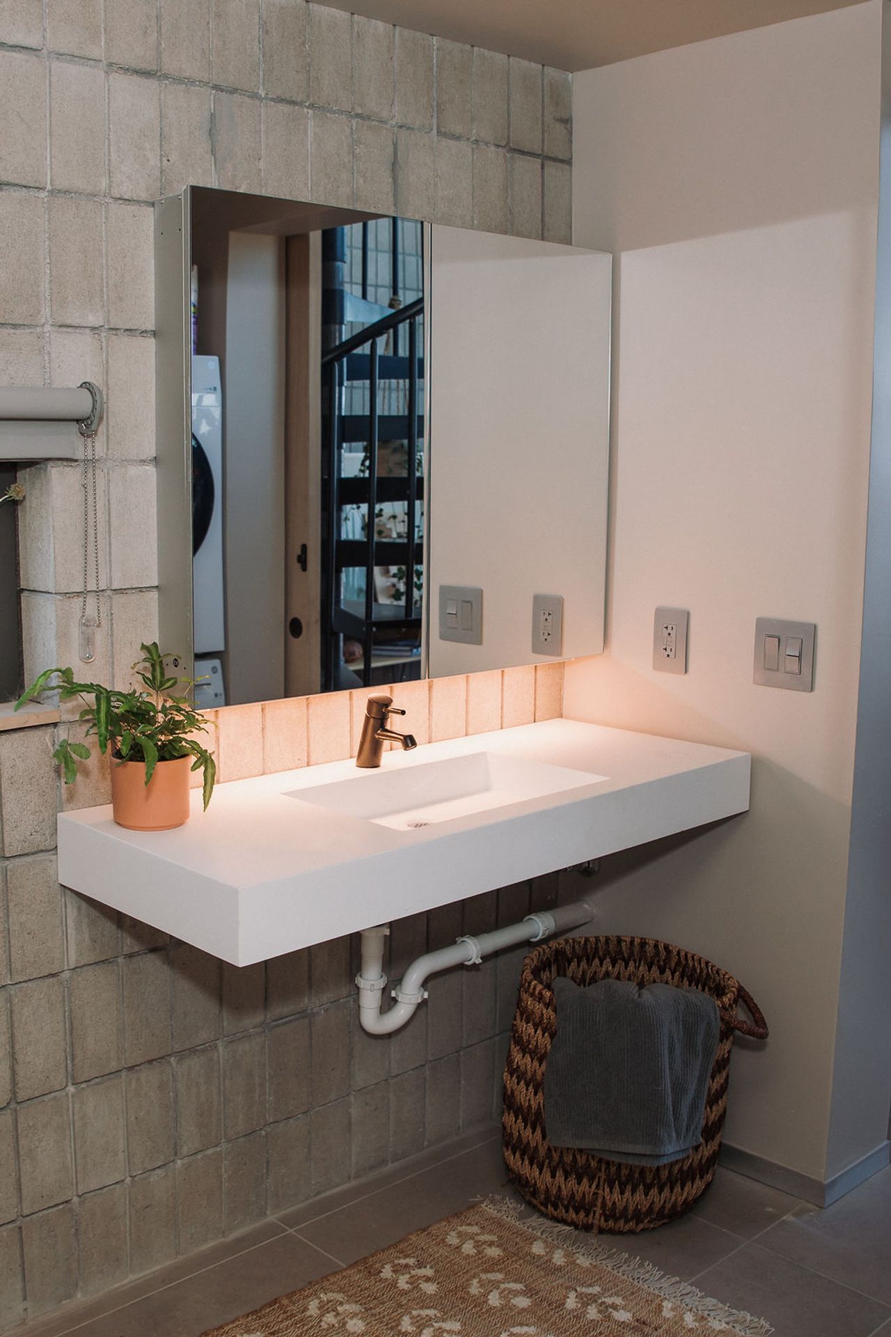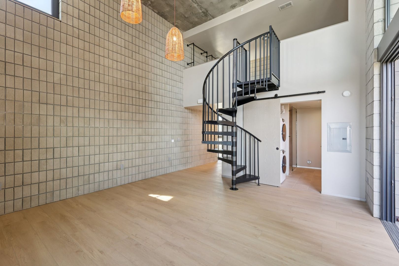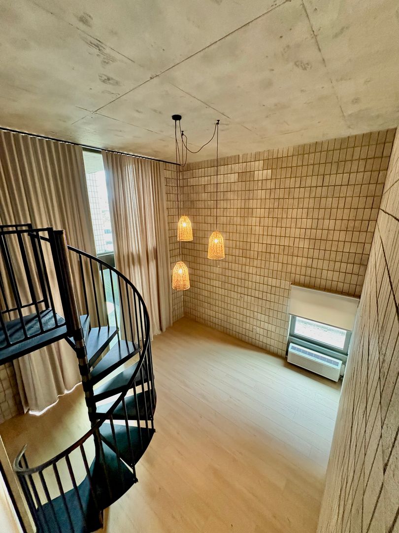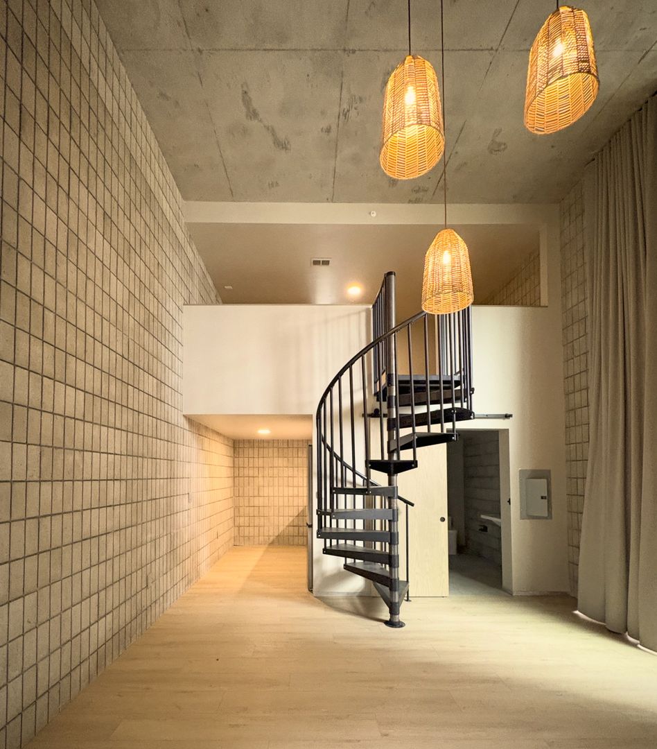 Soaring 16-foot floor-to-ceiling windows and a 10-foot-wide sliding glass door seamlessly connect the living space to the private patio, creating an expansive indoor–outdoor experience. A lofted bedroom features built-in modular shelving, while exposed masonry walls and concrete ceilings pair with wide-plank oak flooring for a warm, modern contrast.