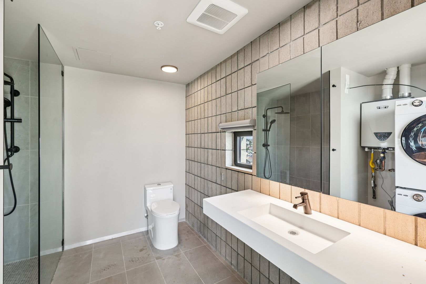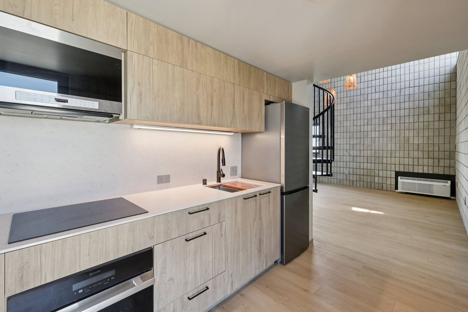 The fully integrated European kitchen includes premium stainless-steel appliances by Sharp, Summit, and Fisher & Paykel, complemented by color-cord designer pendant lighting. Blackout floor-to-ceiling drapery, a walk-in shower, and full-size GE stacked laundry complete this thoughtfully designed home.