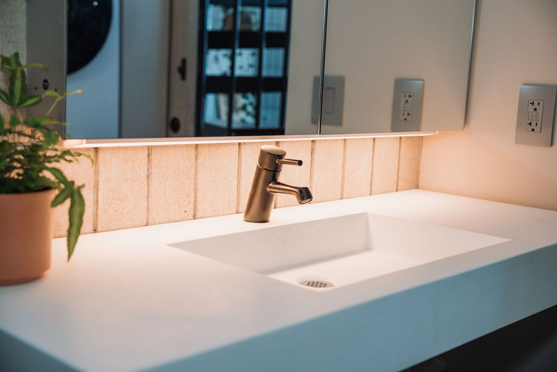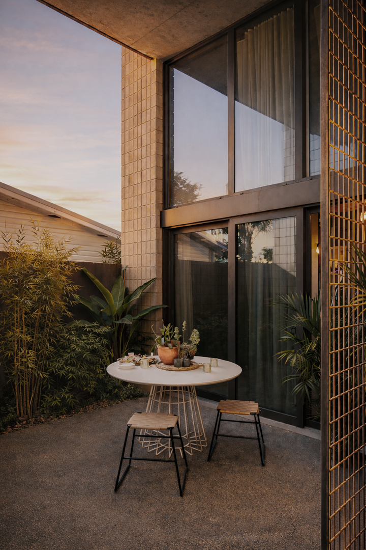 A gated, ground-level residence with private entry and smart access. The large patio is wrapped in lush, layered landscaping—bamboo, tropical foliage, and mature plantings—creating a private outdoor room that feels calm, immersive, and secluded. An ideal setting for morning coffee, evening dinners, or quiet retreat.